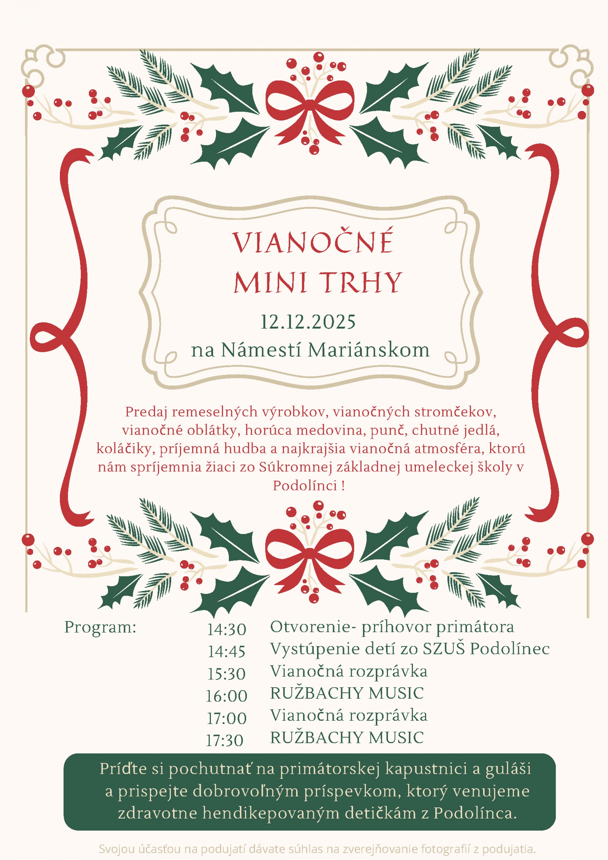 Srdečne vás pozývame na predaj remeselných výrobkov, vianočných stromčekov, chutných jedál, koláčikov, punču, horúcej medoviny a tradičných vianočných oblátok. O príjemnú atmosféru sa postarajú žiaci zo SZUŠ Podolínec.